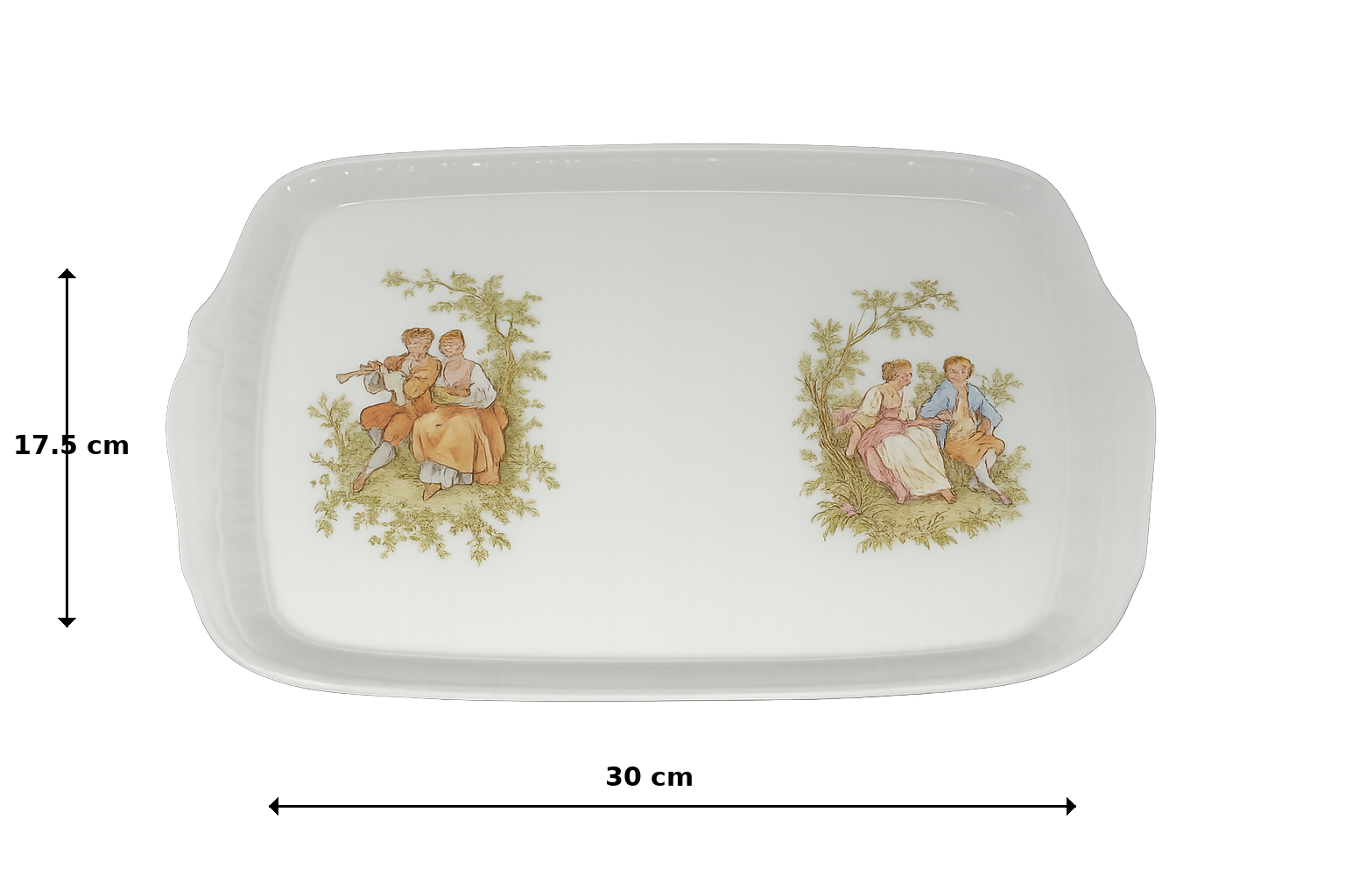 Bring timeless charm to your table with this elegant fine porcelain serving platter, made in the Czech Republic. Measuring 30 cm long and 17.5 cm wide, it’s the ideal size for serving appetizers, pastries, side dishes, or desserts in vintage style.